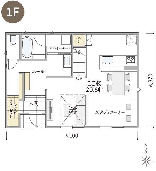 2Fの吹抜けに面したホールにスタディコーナーを設けた、Kurumuならではの間仕切りのないプランです。