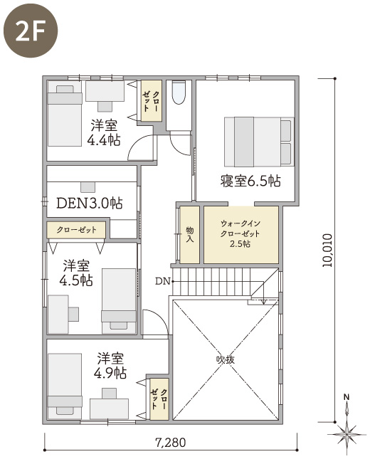 2Fには4つの洋室とプラスαのスペースとして書斎や趣味の部屋などフレキシブルに使えるDENのあるプランです。