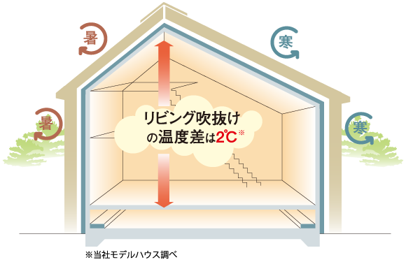 高い吹抜けや、大きな窓、リビング階段など冷暖房効率が下がるはずの広い空間でも温度差を抑制