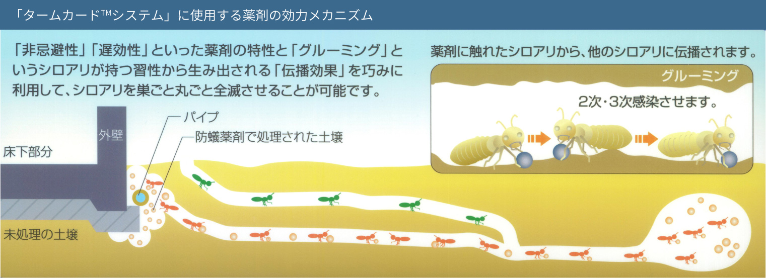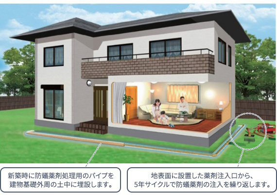 タームガードシステムとは建物周囲の土中に埋設した薬剤注入用のパイプから、地中に防蟻薬剤を注入するシステムです。施工範囲が土中にあるため、居住空間内部に塗布した薬剤の揮発といったシックハウスの問題にも対応した画期的なレスケミカル工法です。