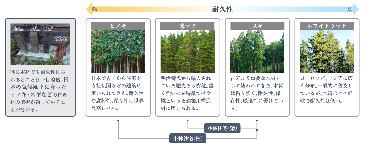 一般に多く使われているホワイトウッドは耐久性が非常に低い。