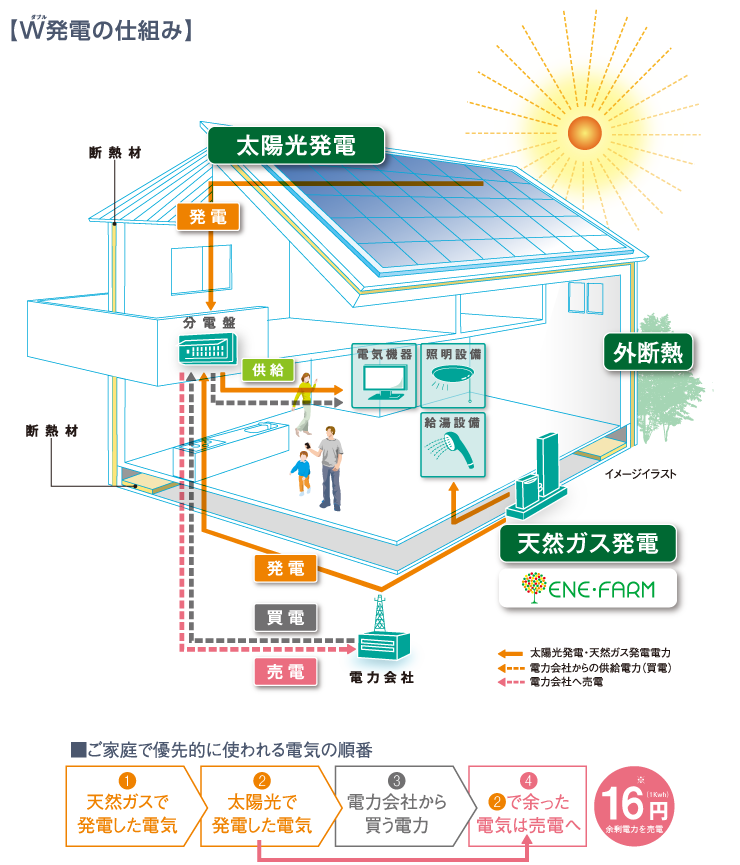 ダブル発電は、環境にやさしく、家計にもやさしい、一歩先行くこれからの住まいのエネルギーシステムです。