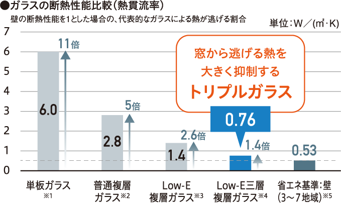 下のグラフは、省エネ基準の壁の断熱性能(熱貫流率0.53)を1とした場合、採用するガラスと壁を比較して熱の逃げる割合を示したものです。トリプルガラスを選択することで、熱損失の軽減が可能です。