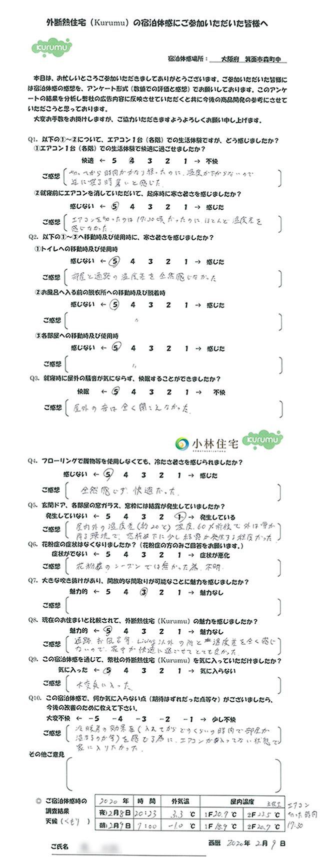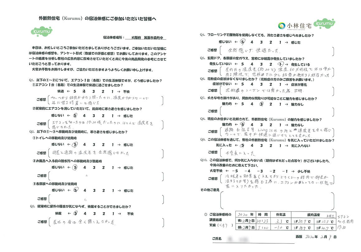 ご購入前のお客様に実際に弊社の宿泊体感モデルに宿泊して頂くことで、断熱性能の効果を実感して頂いています。お客様には体感を通じて将来のお住まいのイメージを高めて頂くことができます。またそこから頂いたお客様の生の『声』は弊社の家づくりに役立っています。