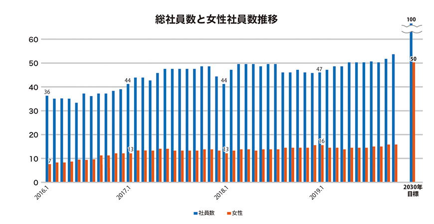 2030年までには雇用を現在の1.5倍に、女性社員に関しては社員数の50%へ推進してまいります。