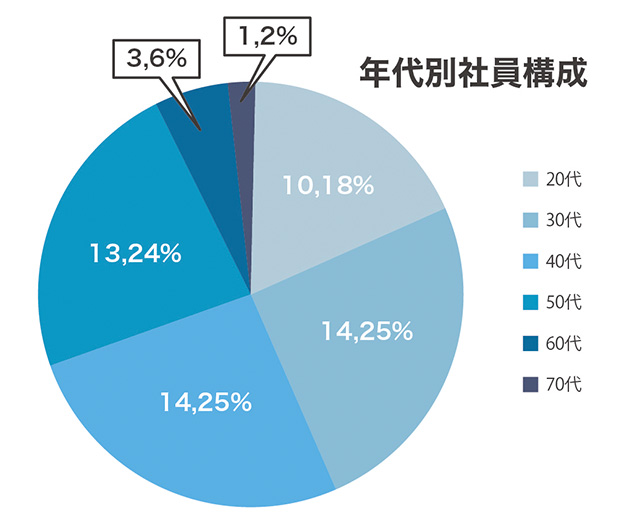 雇用に関しても、3年で1.5倍増と積極的な採用を行うとともに年齢・男女問わず採用を進めており、年代別社員構成もシニア層・ミドル層を採用することでどの世代においても働きやすい環境を整えております。