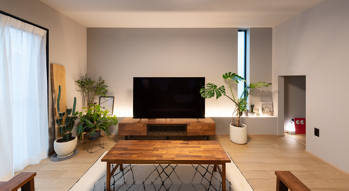 夫:本当に住み心地が良くてもう1泊したいぐらいでした。泊まった時の感覚が良くて、今の家に反映したのがテレビ裏の間接照明ですね。これは絶対に採用したいと思いました。あとはもともと吹抜けを作る予定だったんですが、子供にとってはもしかしたら危ないのかな、音が響くなぁと体感して吹抜けはなくしたんです。展示場でも家具とか照明のスイッチとか反映させた部分は多いですね。なによりも住み心地を大事にしてたので、長く住む、快適に過ごせるっていうところが体感できたのは良かったです。