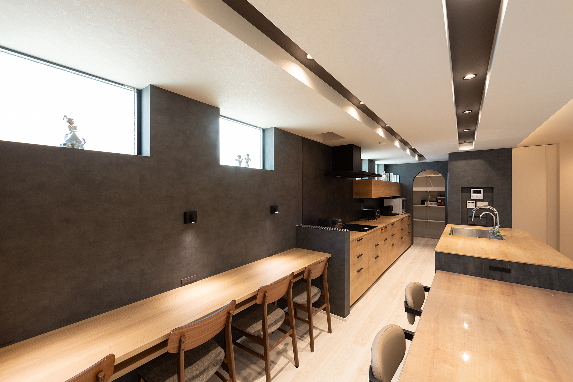 下がり天井に採用したダウンライトの直線ラインがお洒落。
