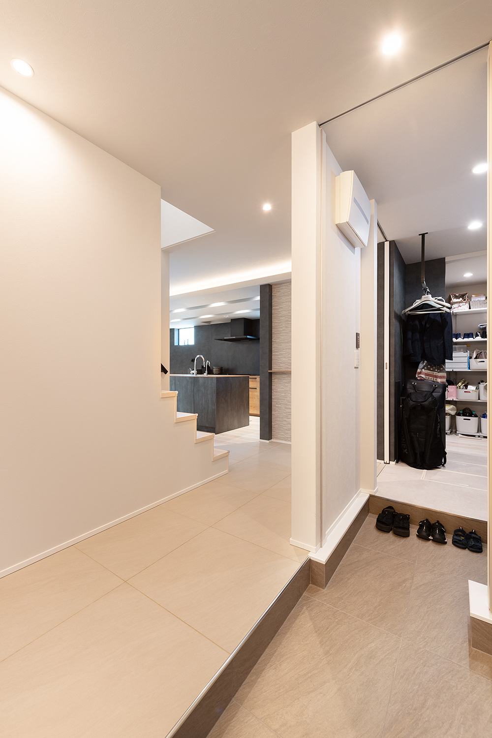 2WAY動線の玄関。エントランスサイドクロークからパントリー、キッチンへも一直線で買物からの帰宅時などに便利です。