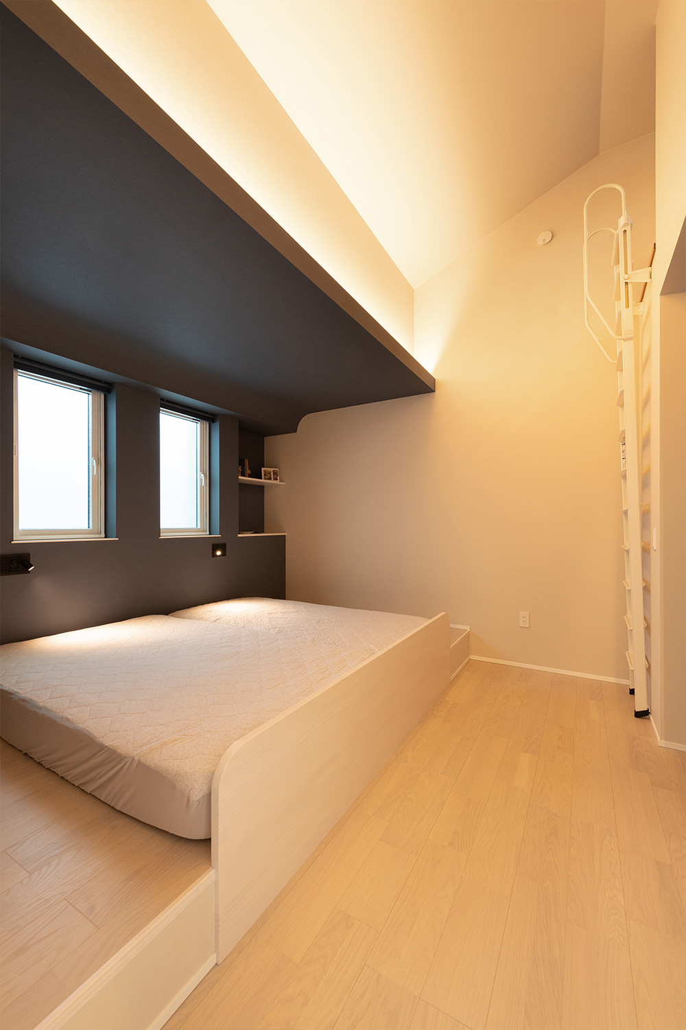 ベッドのスペースを小上がりにした主寝室は、勾配天井へとのびる間接照明がくつろぎの空間を演出。
