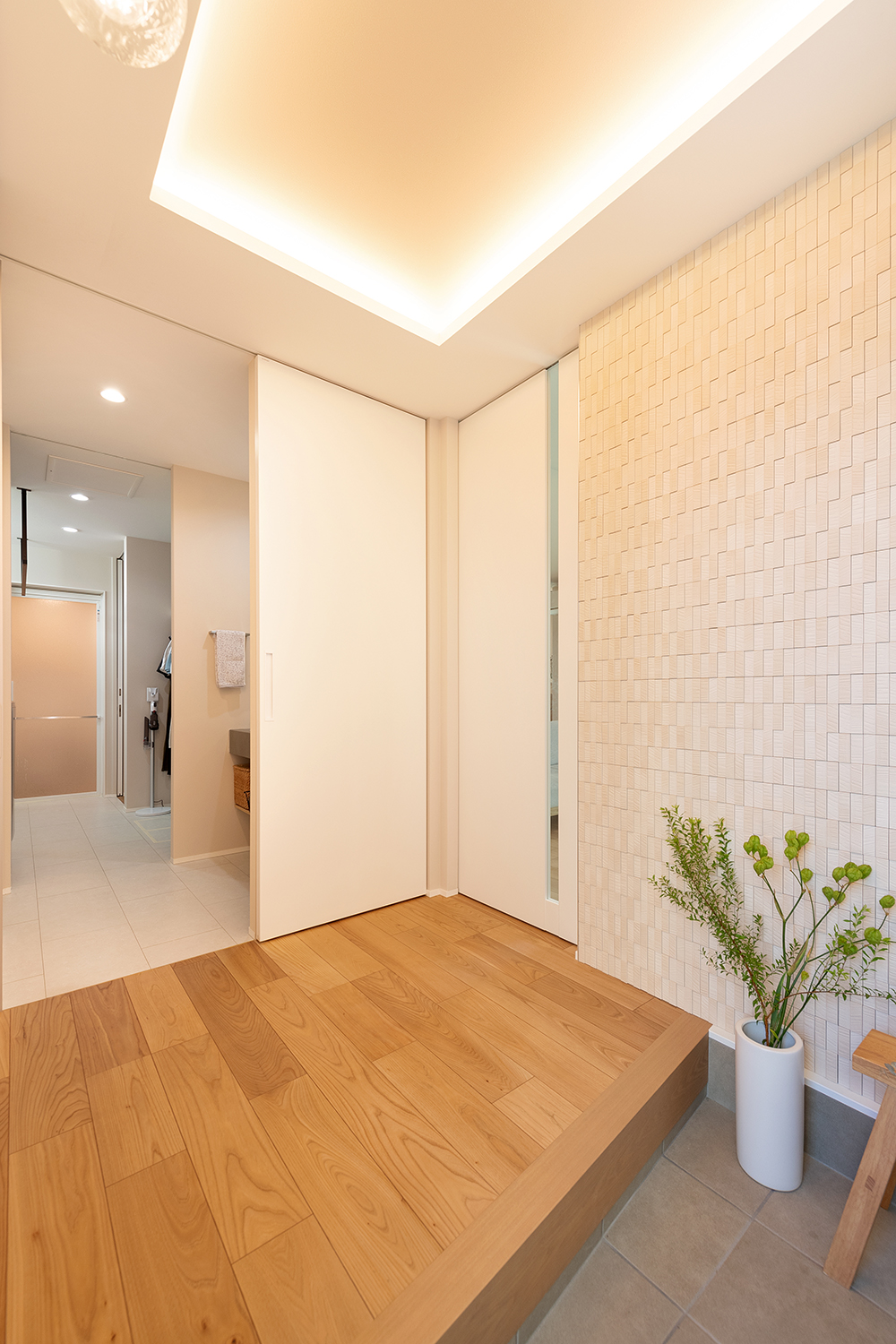 玄関ホールからも洗面室・浴室・トイレといった水まわりへ直接行ける動線を確保。部活帰りの子どもたちが使いやすいようにしました。