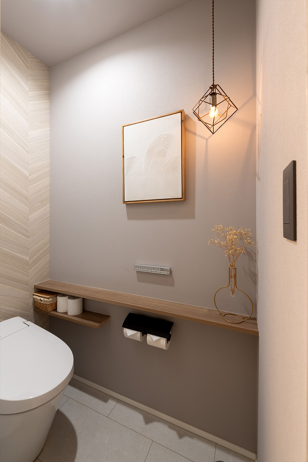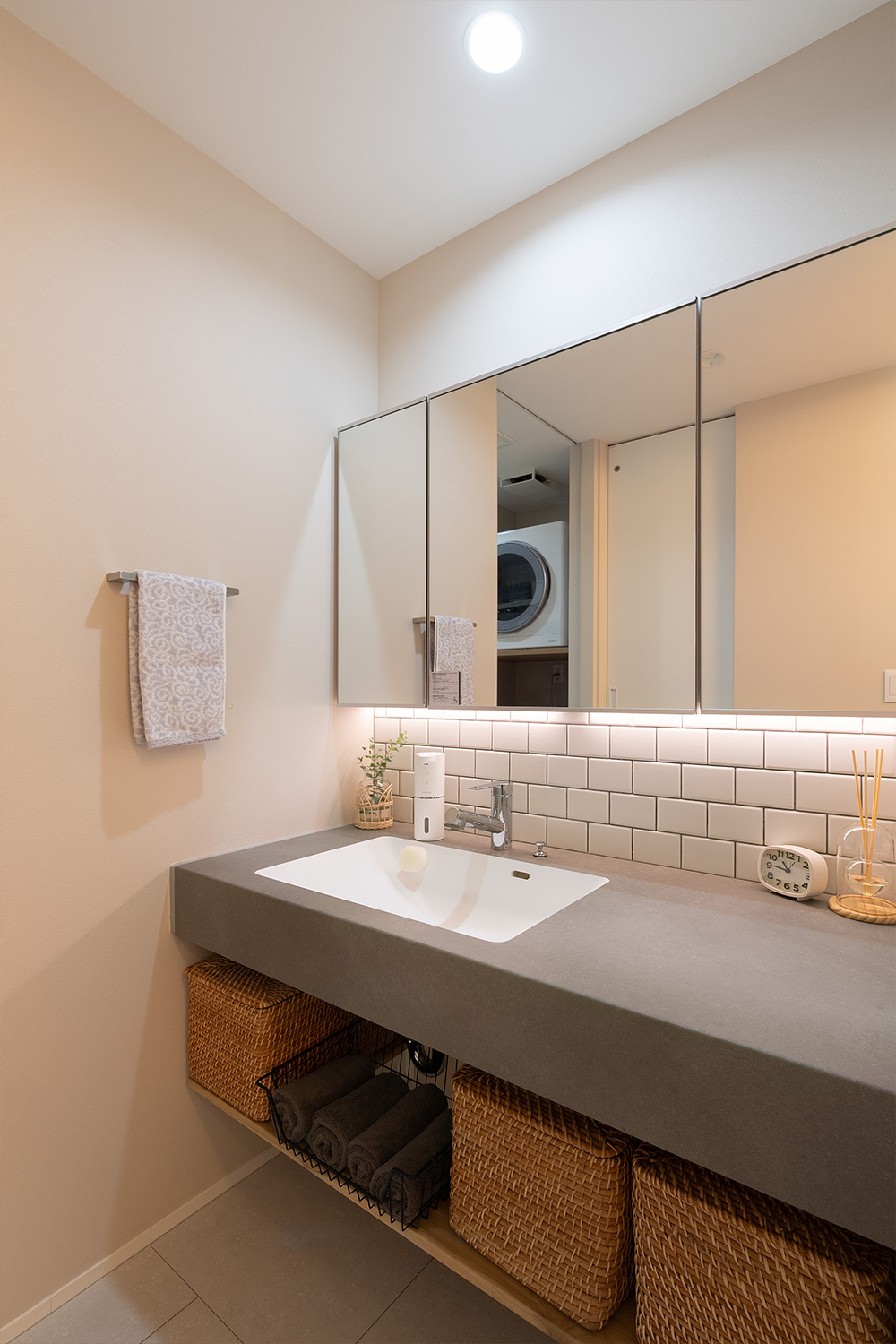 ゆったりとした幅のある手洗いスペースは、モルタル調のカウンターとタイル貼りでホテルライクな雰囲気に。