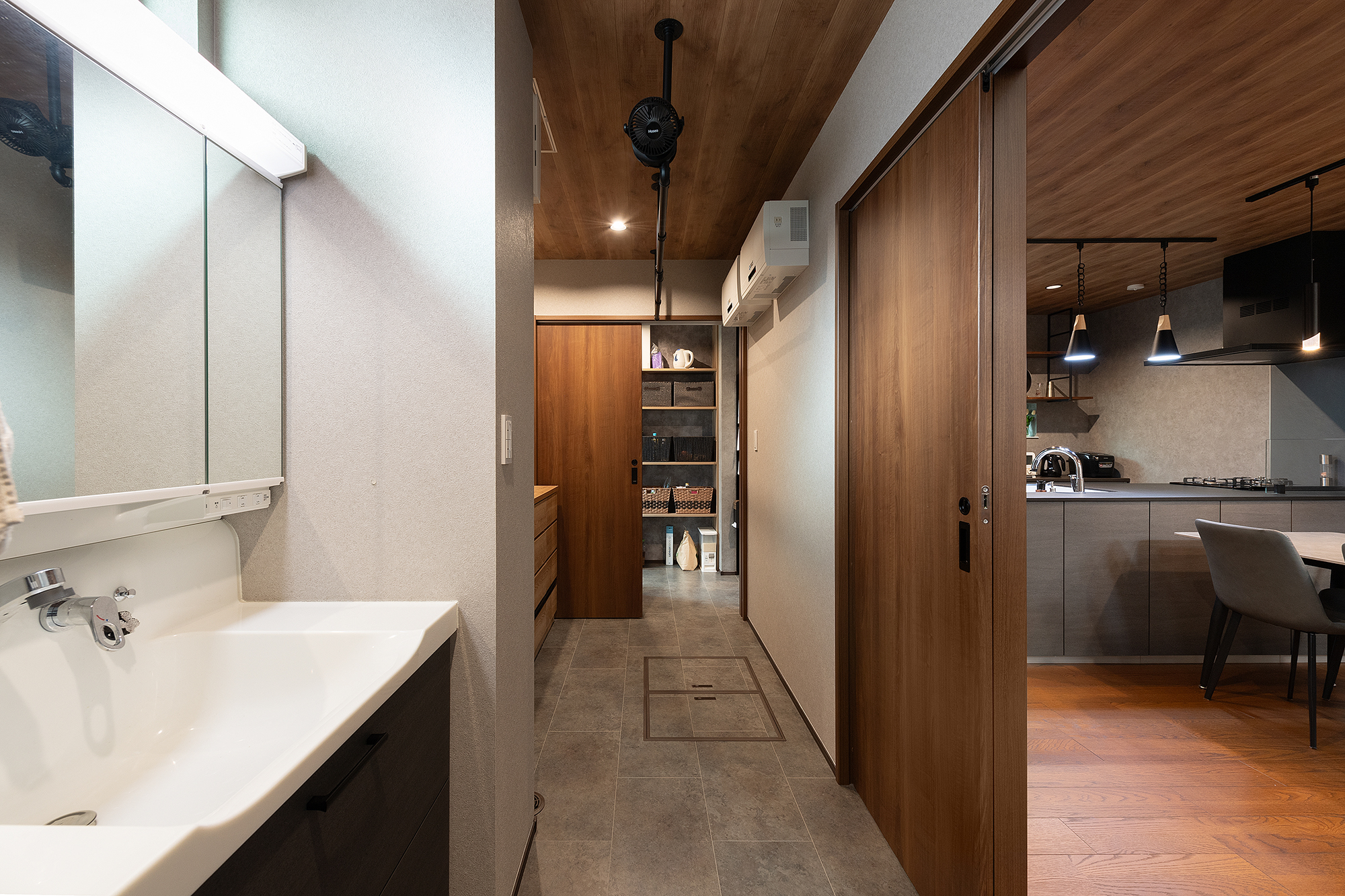 パントリーまで一直線の動線はキッチンへ回遊できる利便性も秀逸。