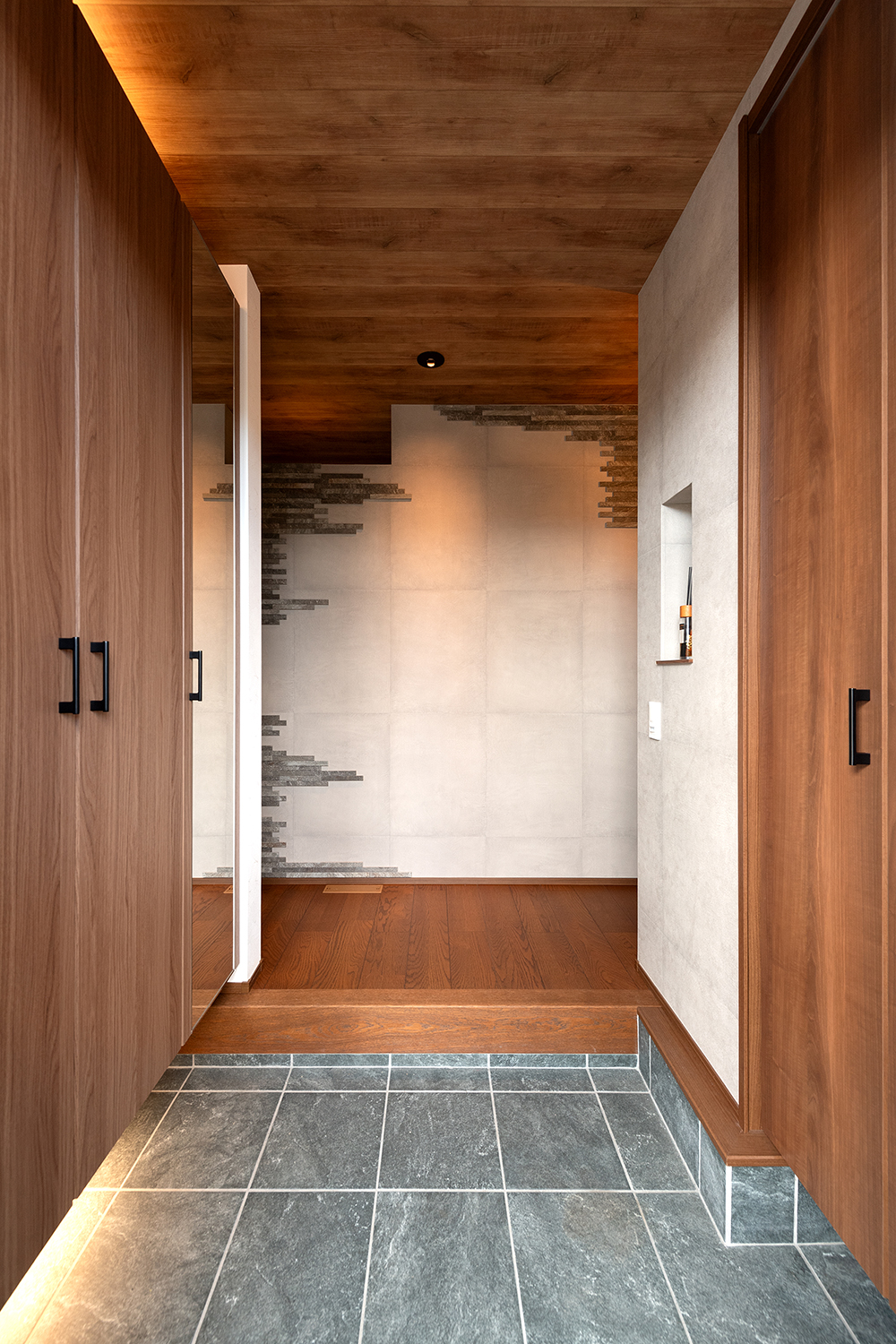 左側にシューズボックス、右側にシューズクロークを設けスッキリとした玄関。木の天井やアクセントタイルの壁がスタイリッシュな空間を演出。