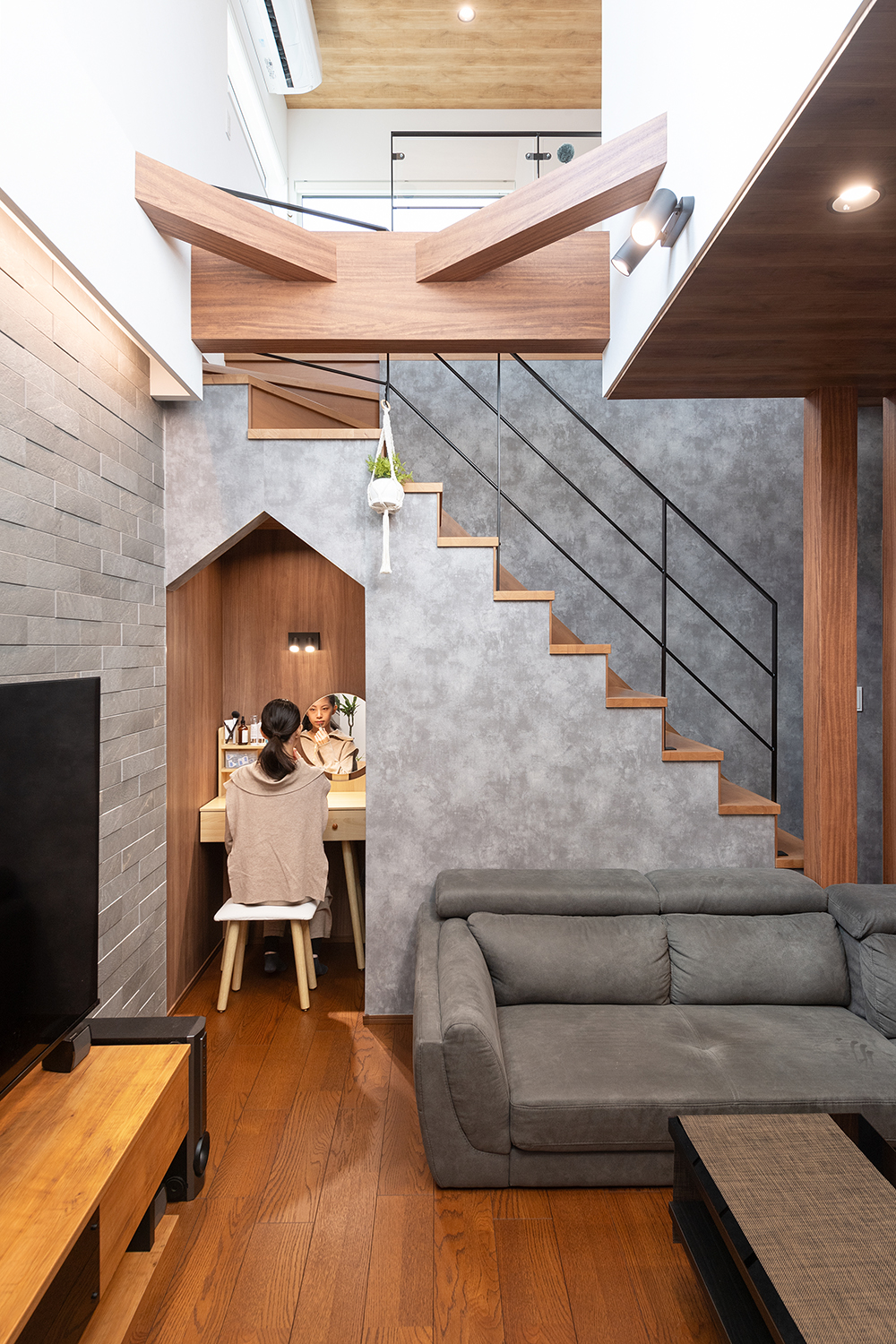 奥様の念願だったリビングに配置したドレッシングルームを階段下に設計。三角の垂れ壁をアクセントに空間をゆるやかにつなぎます。