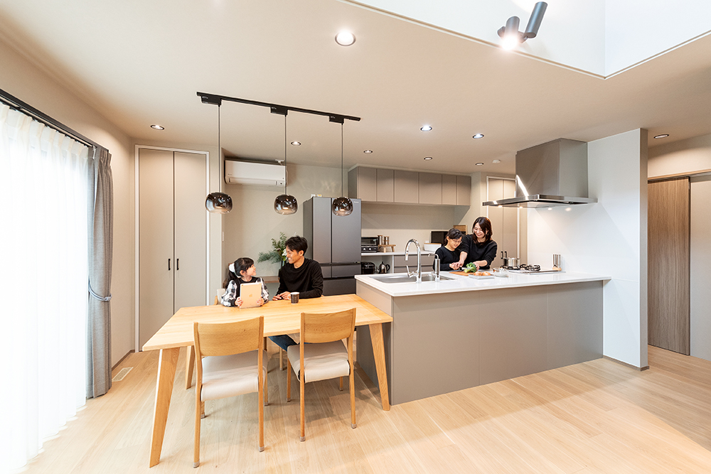 家族が集まるLDKはキッチンを中心とした使いやすい回遊動線を採用。