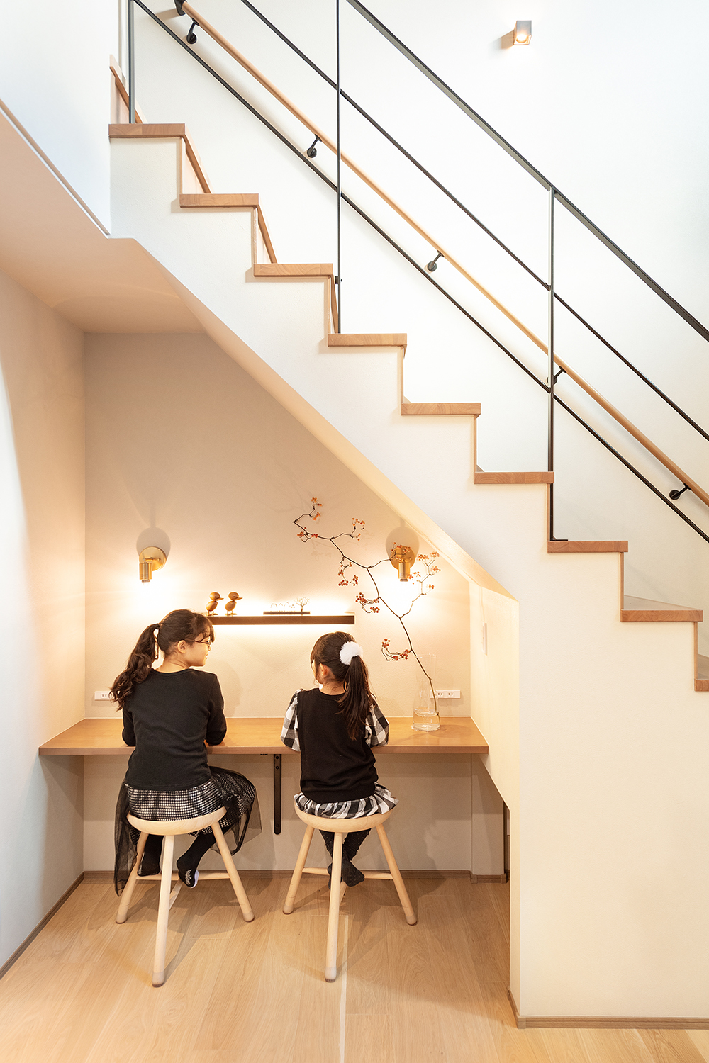 階段下のカウンターは勉強や読書などもしやすい半個室のような落ち着いた空間。それぞれにコンセントもあり便利です。