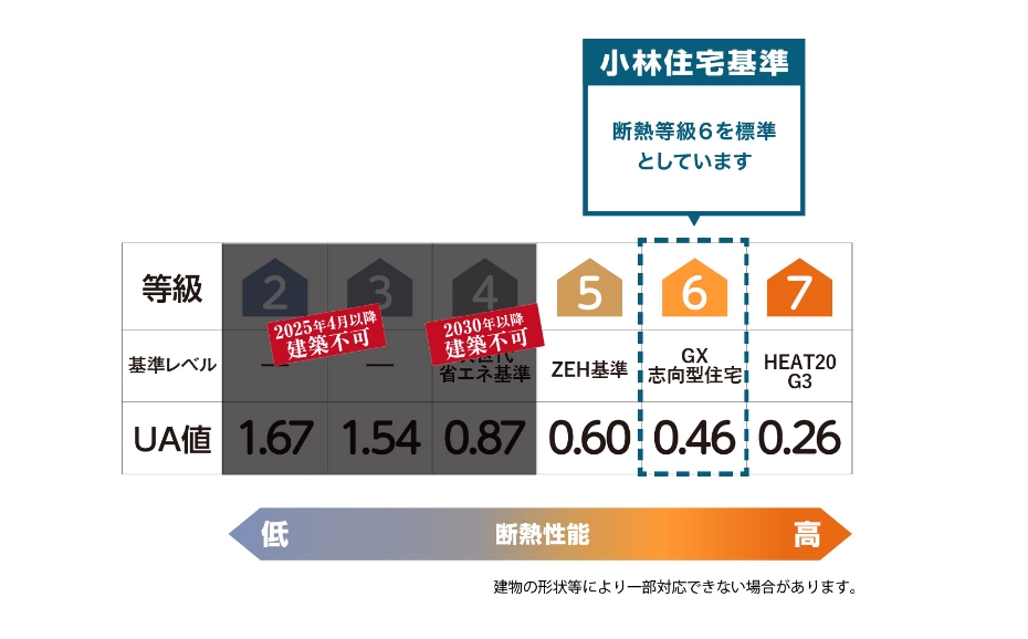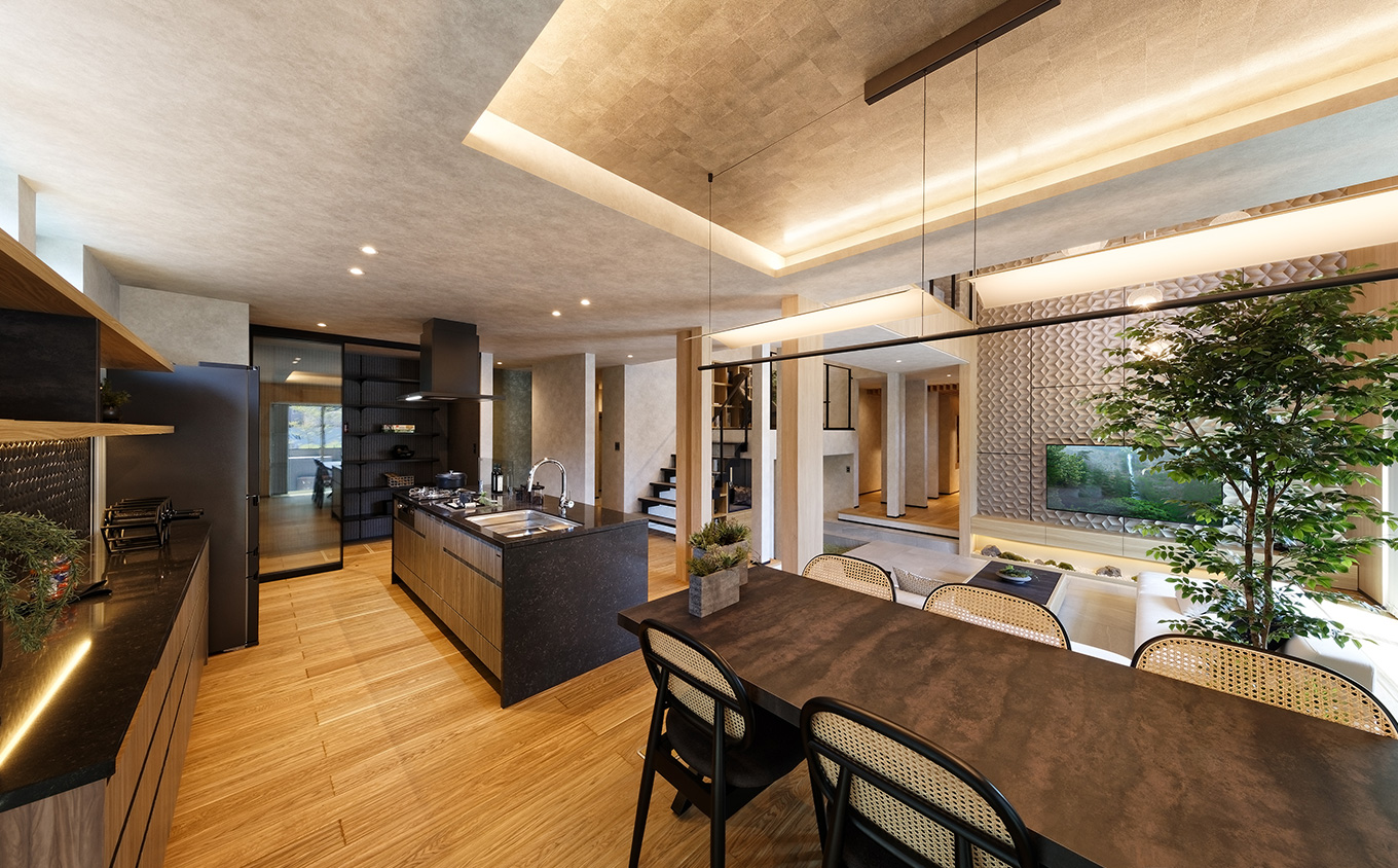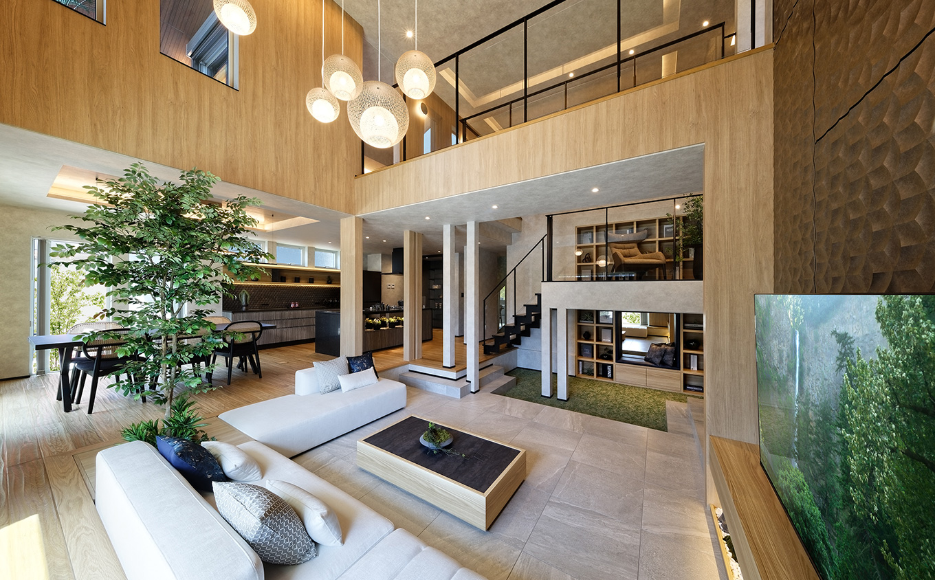 屋根から基礎まで家の外側を高性能な断熱材ですっぽり覆う外断熱工法を採用しています。断熱等級6を標準とした高い断熱性能、気密性能、換気性能を備えた高性能住宅により、計画的に空気の流れを作ることができ、温度ムラが生じにくいのが特徴です。