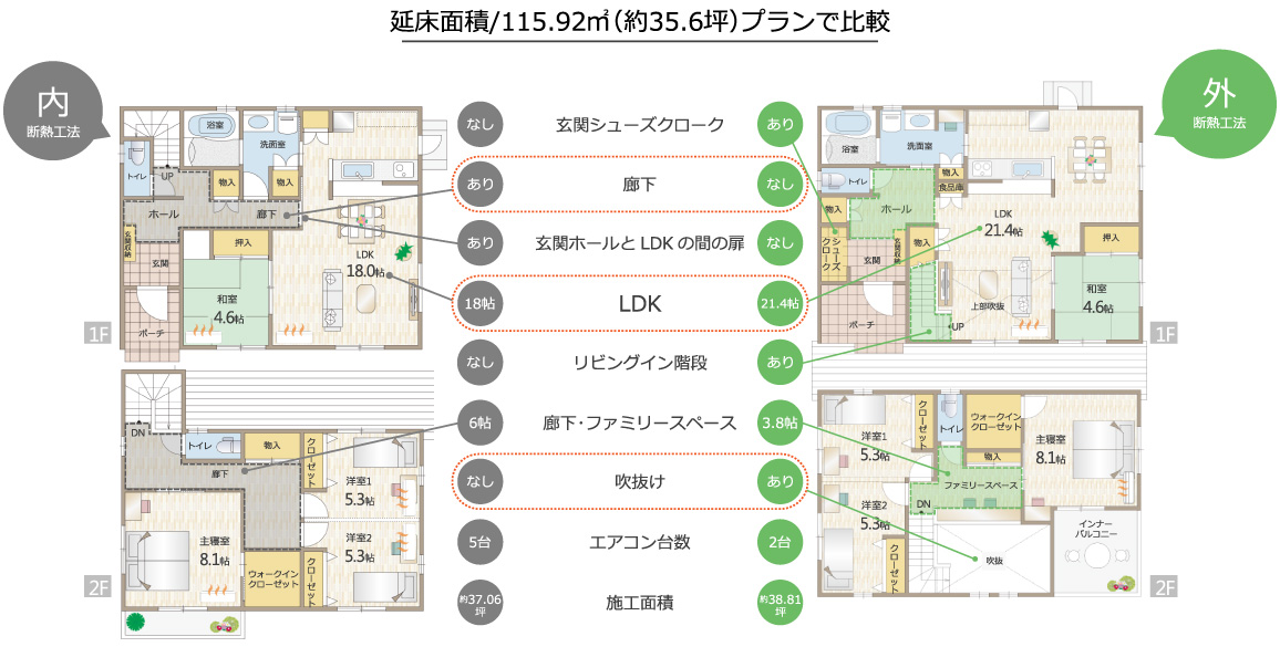 外断熱は、家中の温度差が少なくなるため、間仕切りが不要。無駄な廊下スペースもいらなくなるため、有効面積が大きくなります。