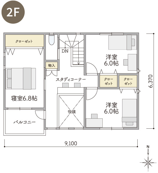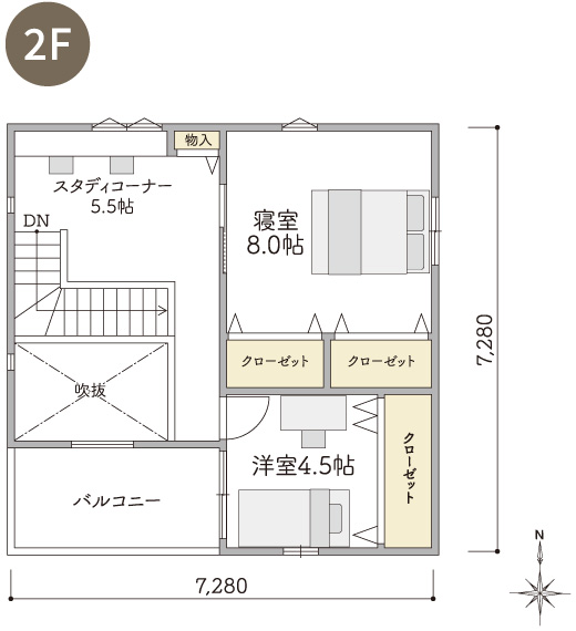 2Fには4つの洋室とプラスαのスペースとして書斎や趣味の部屋などフレキシブルに使えるDENのあるプランです。