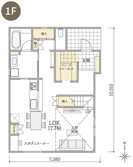 2Fの吹抜けに面したホールにスタディコーナーを設けた、Kurumuならではの間仕切りのないプランです。