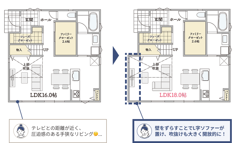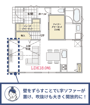 リビングの壁を調整すれば、手狭な空間が一変。L字ソファーや開放的な吹抜けで、毎日が心地よい大空間に生まれ変わります。