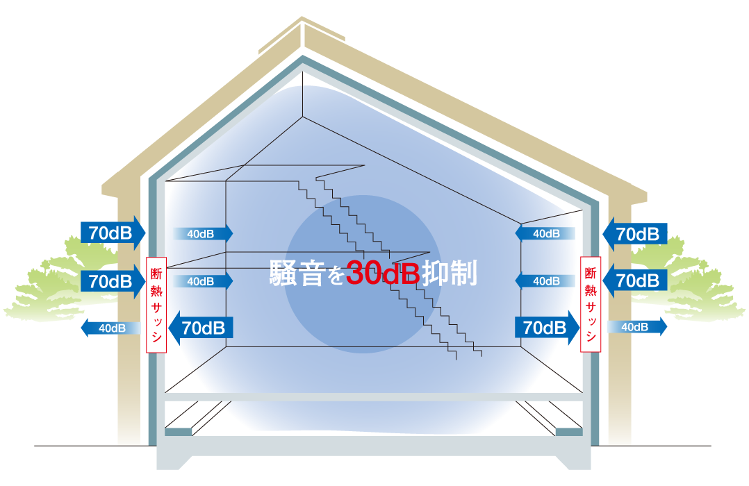 約25dbの音をカットし、住宅の中で音洩れしやすい窓を強化、安らぎの場である室内空間を守ります。