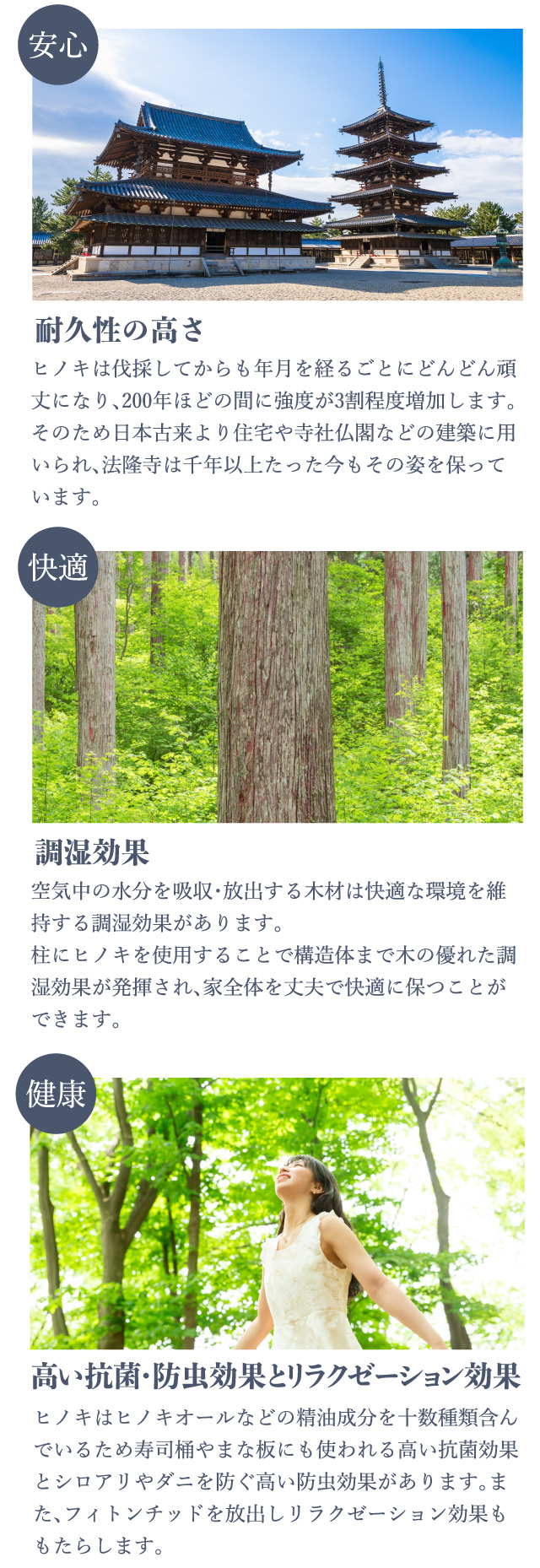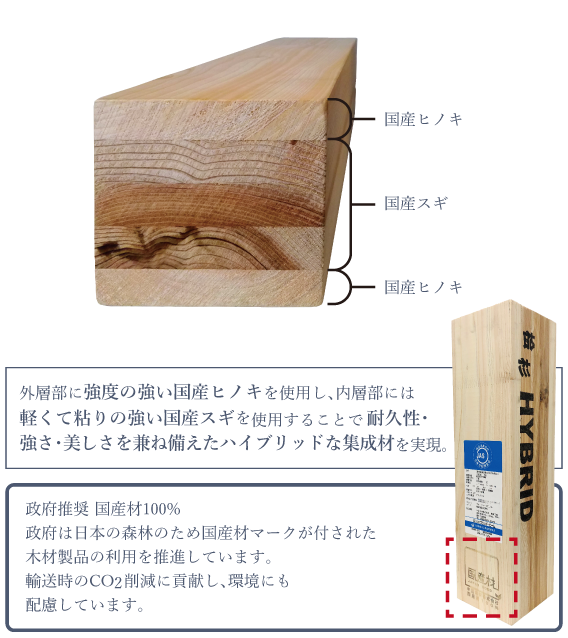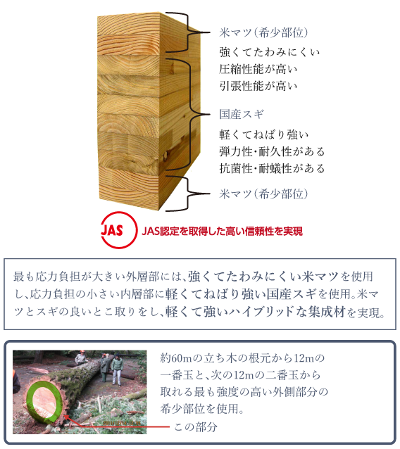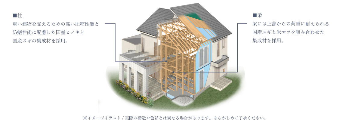 無垢材は育った環境などによって強度にバラツキがありますが、集成材は「強度性能」による評価のため全ての住宅に均一な品質を実現。