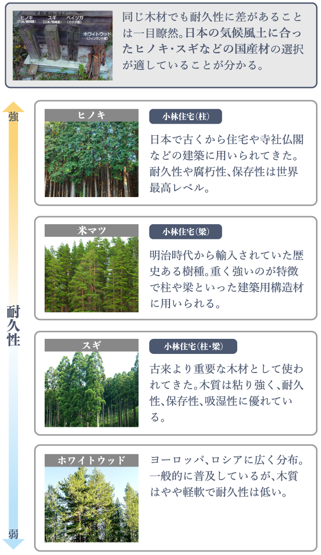 一般に多く使われているホワイトウッドは耐久性が非常に低い。