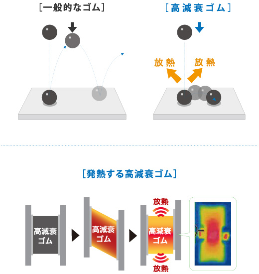 一般のゴムボールと高減衰ゴムボールを地面に落とすと、一般のゴムボールが跳ね上がるのに対し、高減衰ゴムボールはほとんど弾みません。