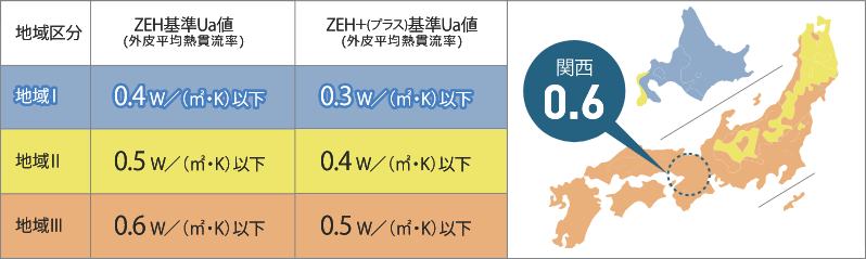 ZEHの基準はUA値(外皮平均熱貫流率:住宅の断熱性能の数値)によって判断されます。