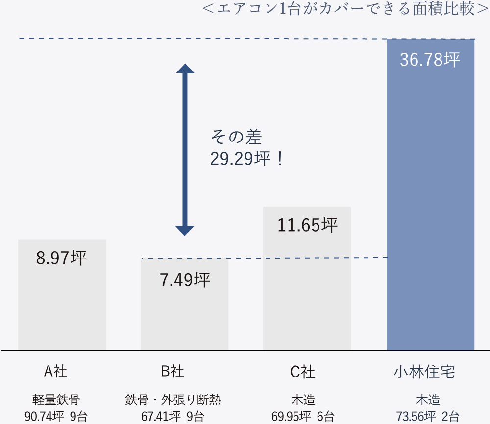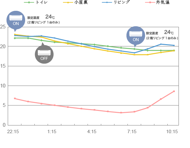 小林住宅のUA値(0.26以下)は、関西のZEH基準だけでなく、北海道基準もクリアしているため、寝る前にエアコンを切っても朝まで室温約20度をキープする保温性に優れた超断熱住宅をご提供できます。