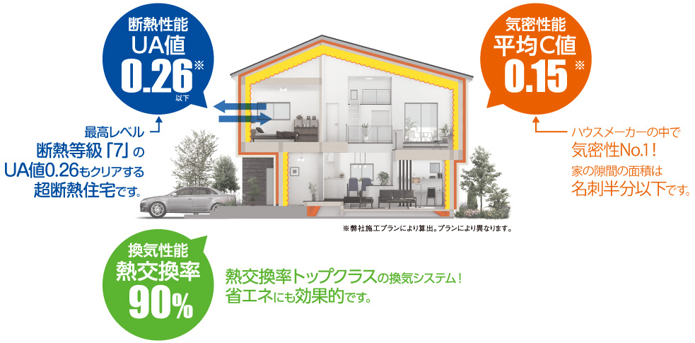 断熱材で構造をすっぽり包み込む外断熱工法。国の推奨するZEH+はもちろん、最高レベルの断熱等級「7」のUA値0.26以下もクリアする断熱性能です。