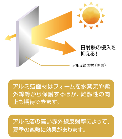 遮熱性能に優れた赤外線高反射タイプのアルミ箔面材を採用。