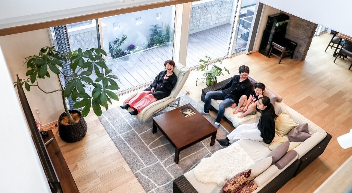 アジアンリゾートがコンセプトというK様邸。大きな吹抜けのあるLDKは、85インチという大型TVでも圧迫感を感じさせないほど開放的。これだけの大空間にも関わらず、エアコン1台だけで家中が快適なのは、基礎部分までしっかり断熱されている外断熱ならでは。