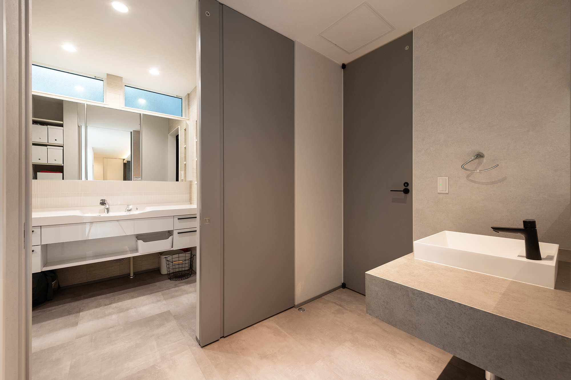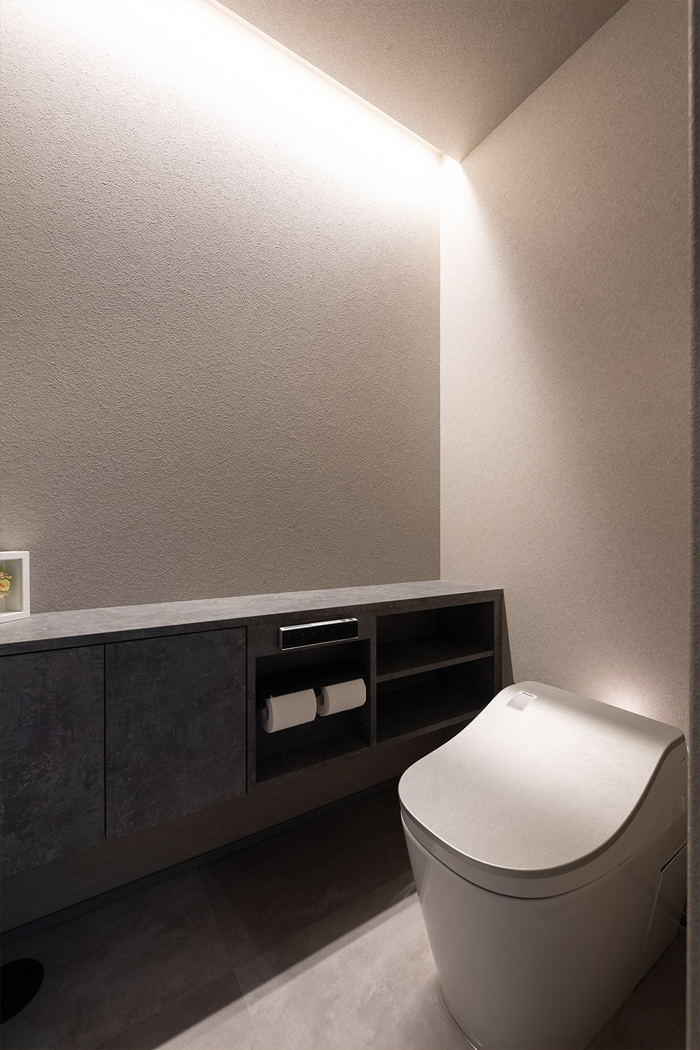光沢感のあるグレー調でコーディネートしたトイレ。間接照明で明るすぎない空間に。