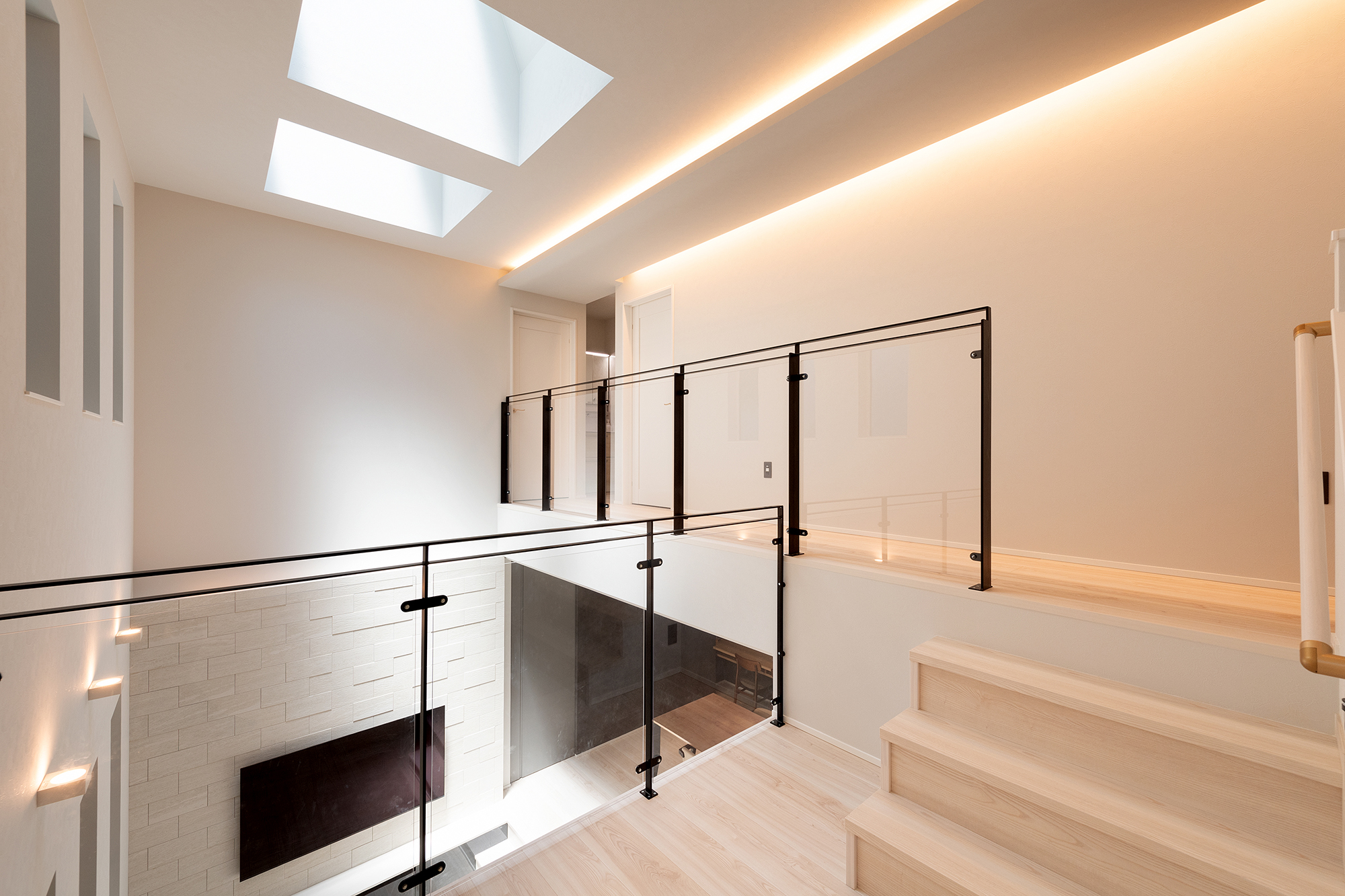 間取りではトップライトのある吹抜け、子どもの遊び場にもなるダウンリビング、ピアノの演奏が楽しいスキップフロア、玄関からの動線が便利なパントリーがお気に入りです。