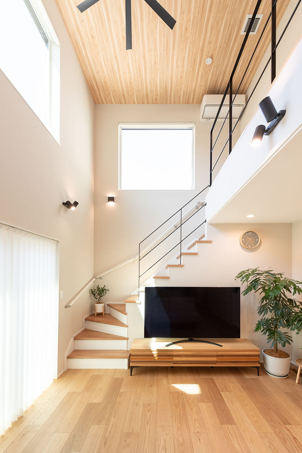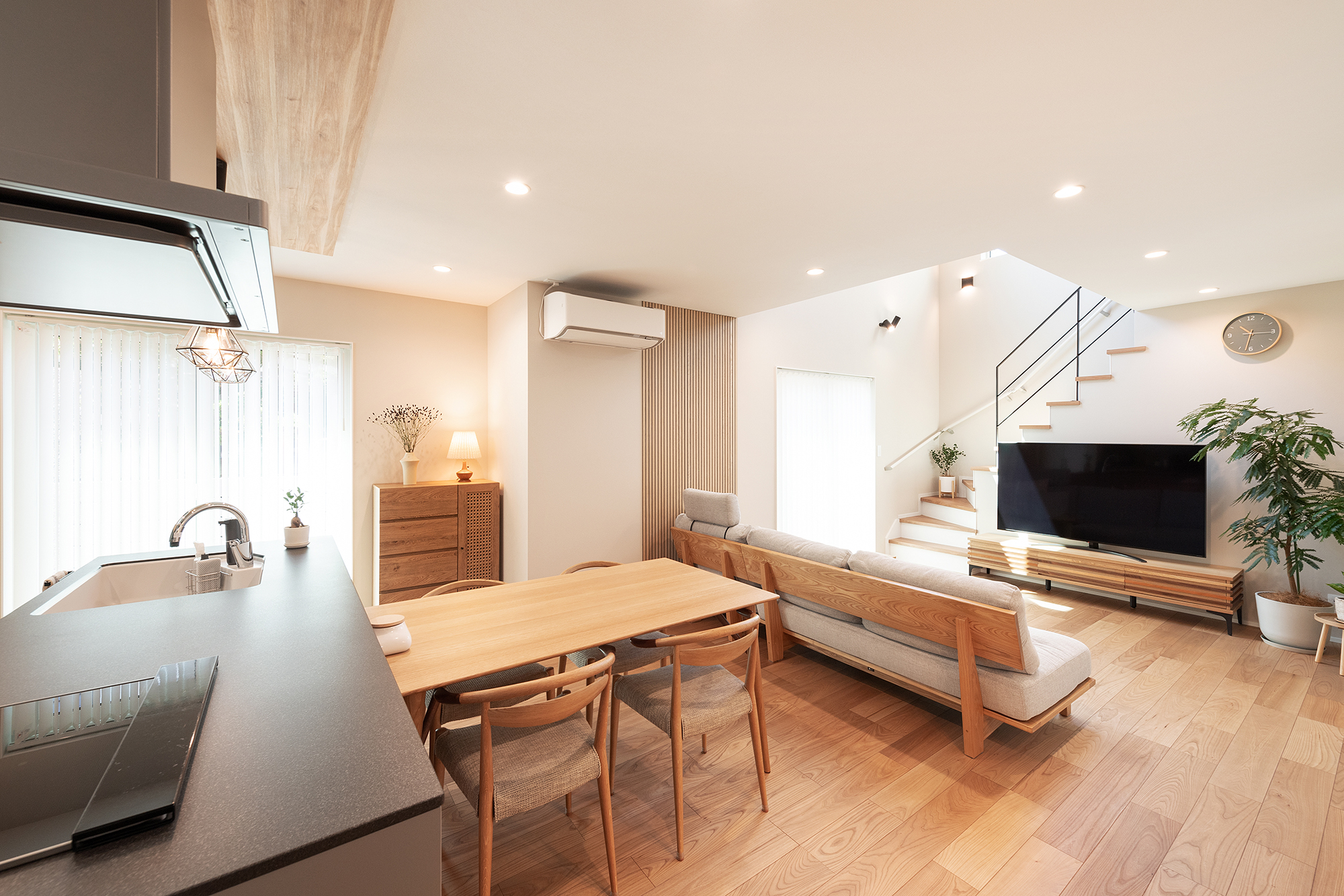 吹抜けやリビング階段などのある開放感あふれる間取りも、高い断熱性と気密性、優れた換気性能によってエアコン1台のみでの生活が実現しました。
