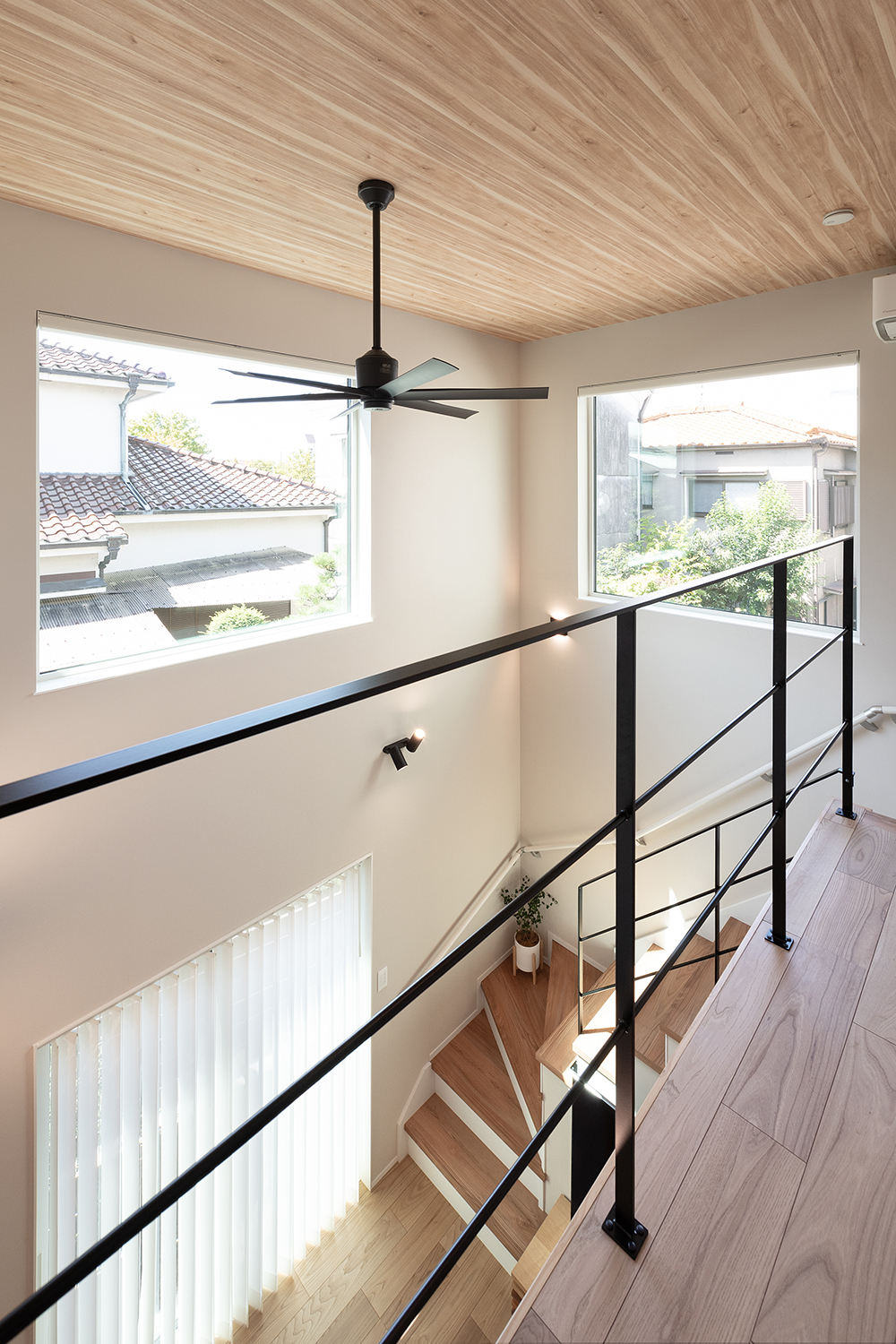 リビングから空を眺められるように吹抜けに大きな窓を2箇所設置しました。