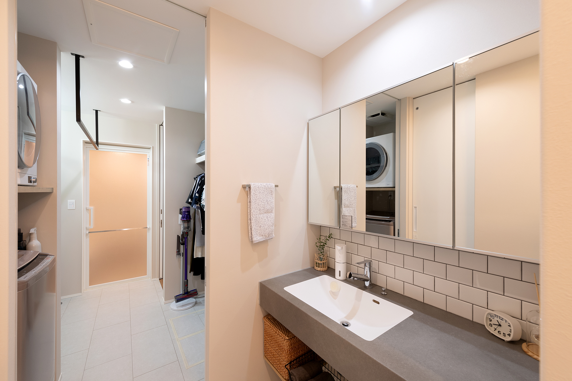 1階で家事が完結できるように浴室と洗面室の間に物干しや乾燥機、