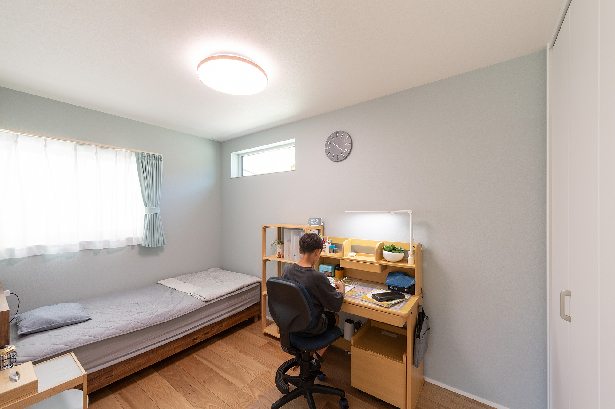 淡い水色のアクセントウォールが可愛い子供部屋は