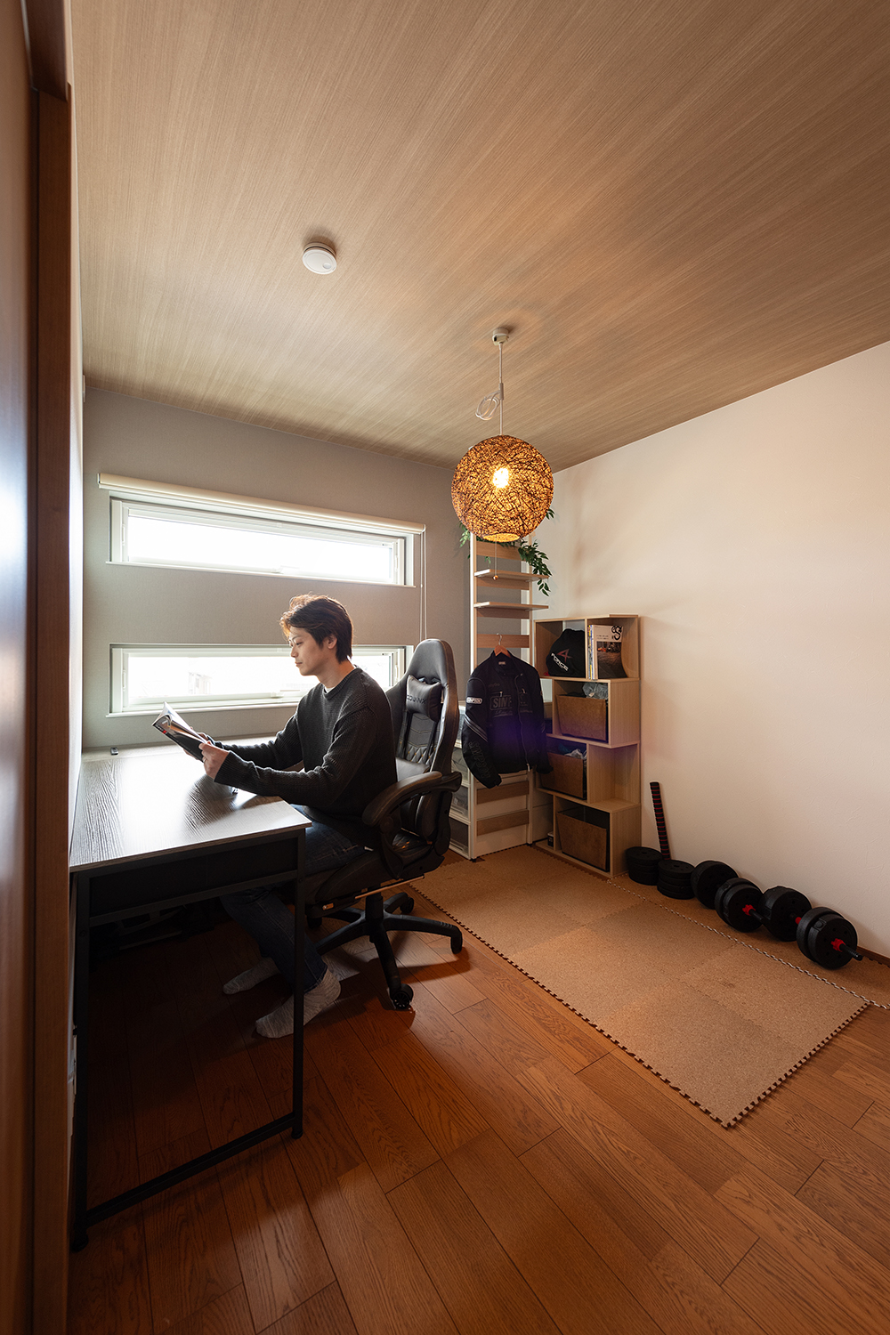 仕事や趣味、トレーニングにも没入しやすい落ち着いた雰囲気ながらも横長の窓がお洒落なご主人のプライベート空間。