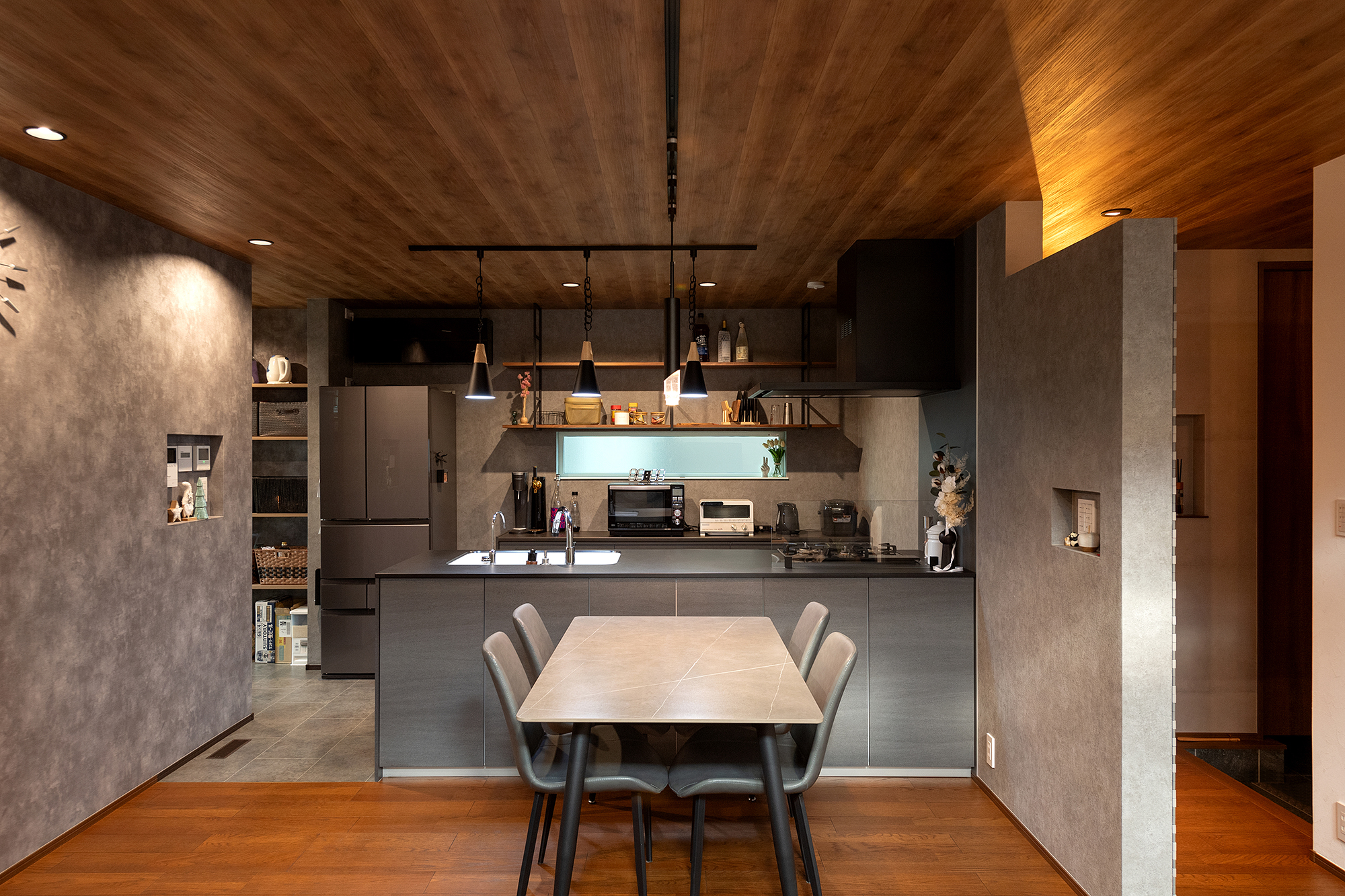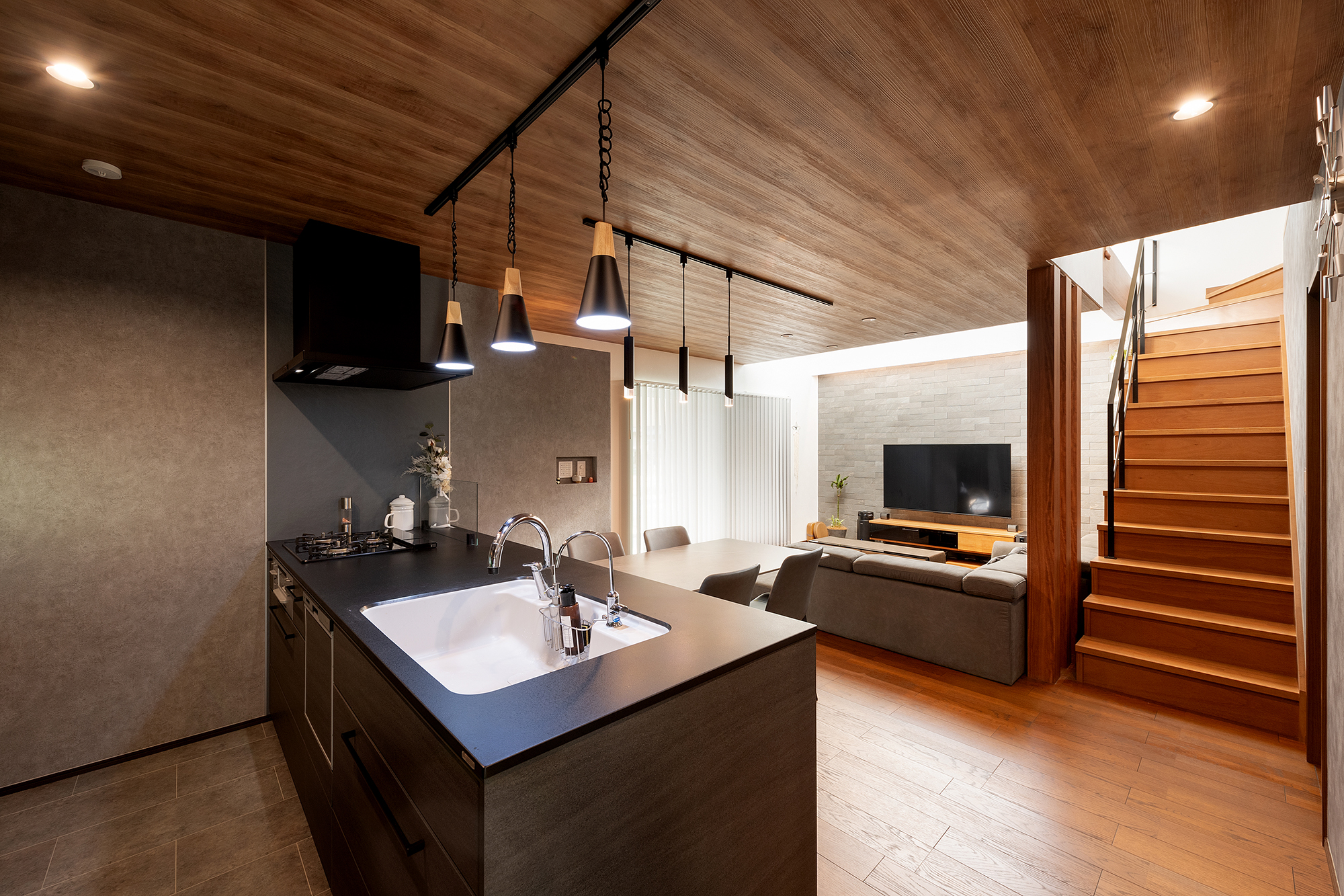 吊り戸棚を設けず木目調の天井が一直線にリビング吹抜けへと繋がるオープンで広がりある空間づくり。
