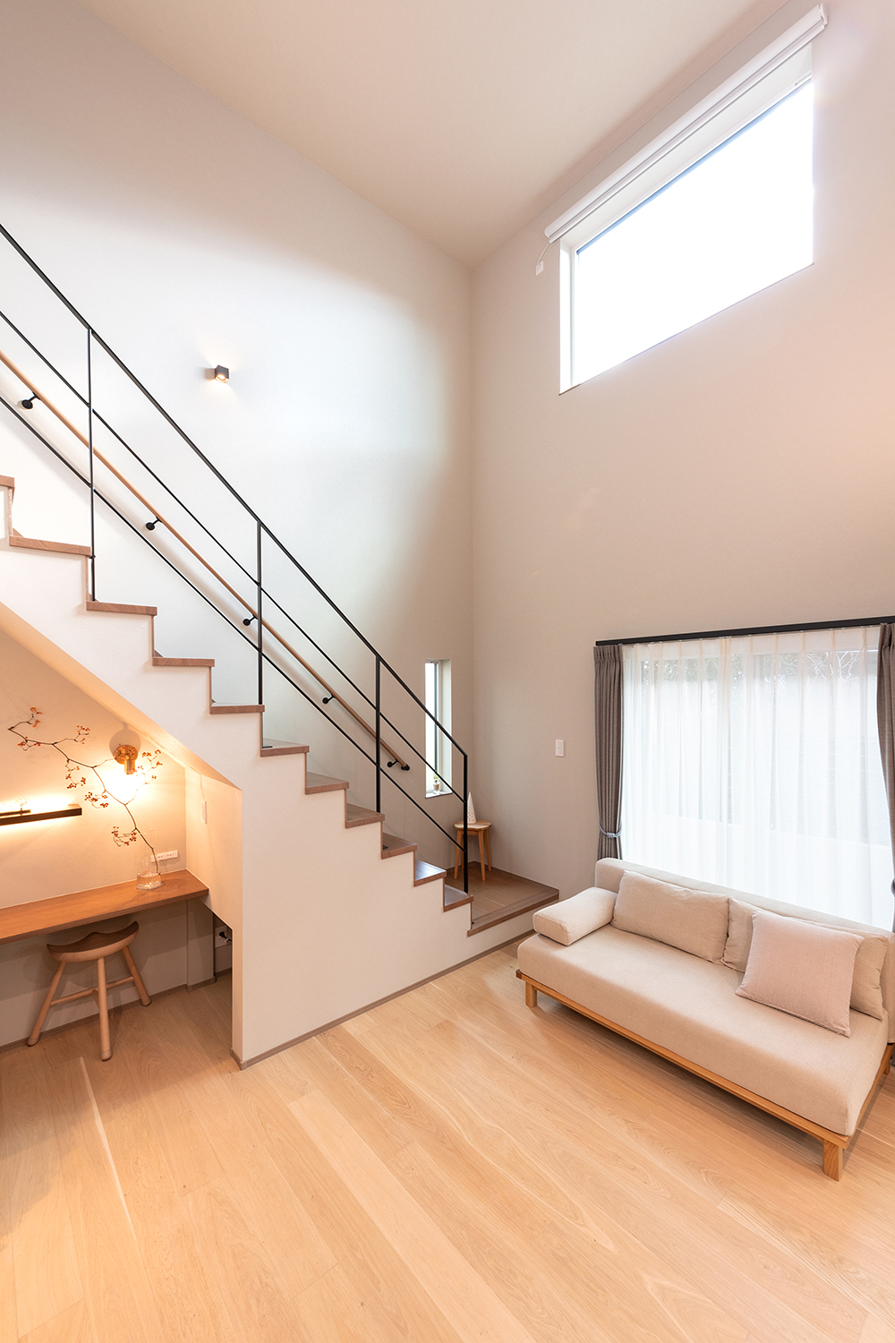 断熱性・気密性の高さを活かしたリビング吹抜けは2階ロフトの勾配天井まで続いているため想像以上の伸びやかさを表現しています。階段下にはカウンターの他に掃除機などの収納に便利な下部収納を設置。