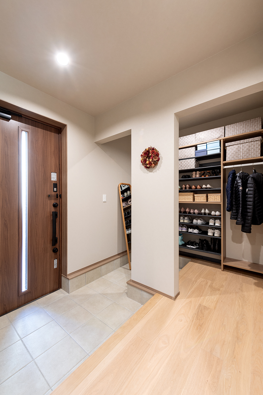 玄関には回遊できる便利なシューズクロークを設置。間仕切りがなくても室内の温度を一定に保つ「Kurumu」ならではの間取りです。