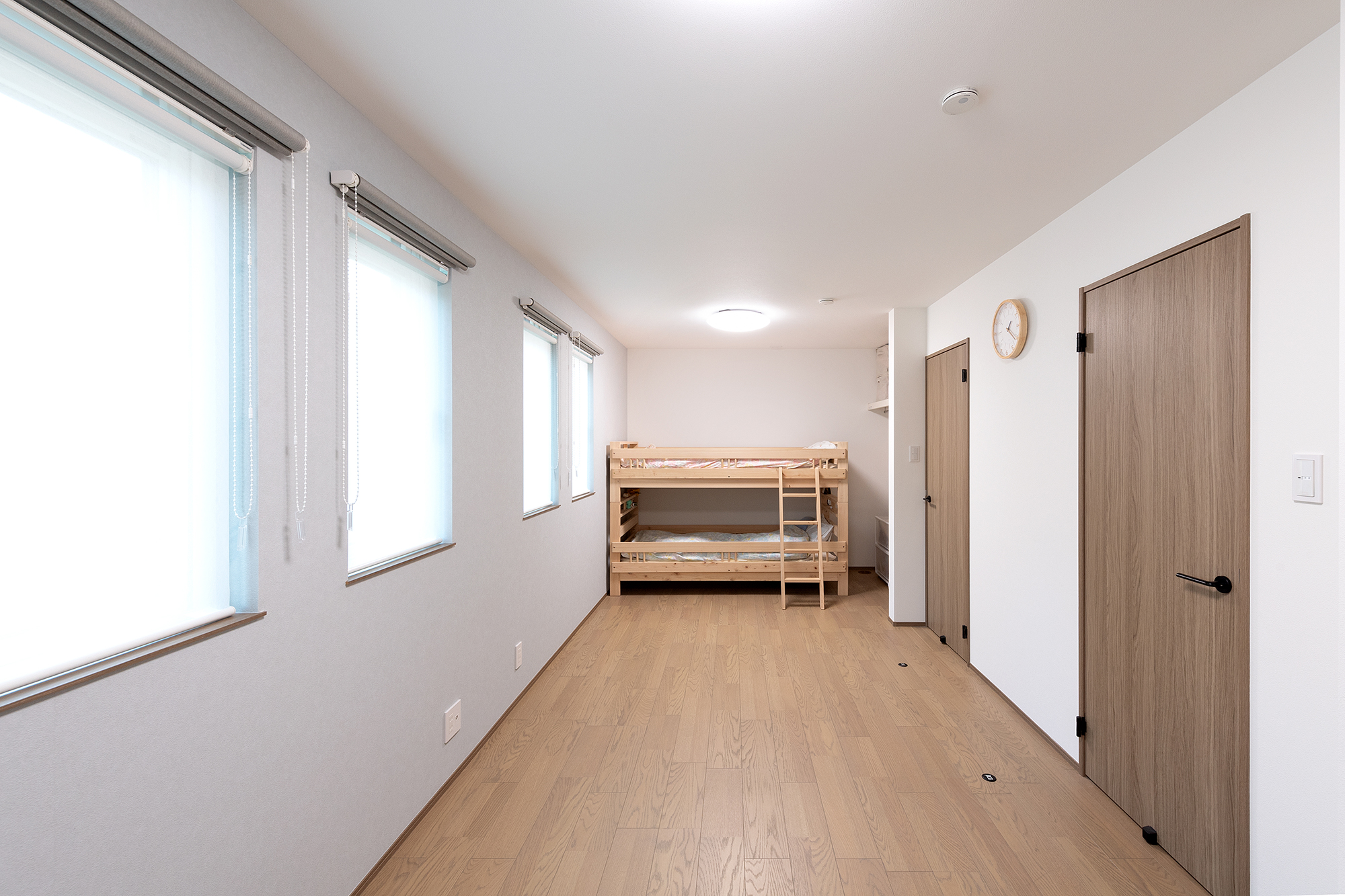 将来的には間仕切りを付けることで2部屋に分けることができる子ども部屋。