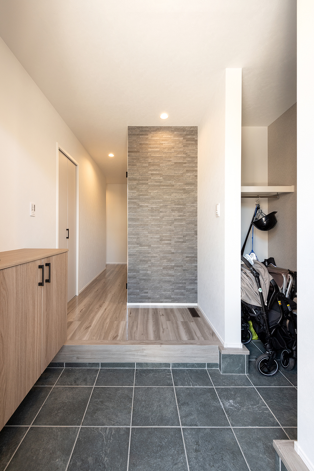 玄関にはシューズクロークを設置してベビーカーなどもすっきり収納できるようにしました。