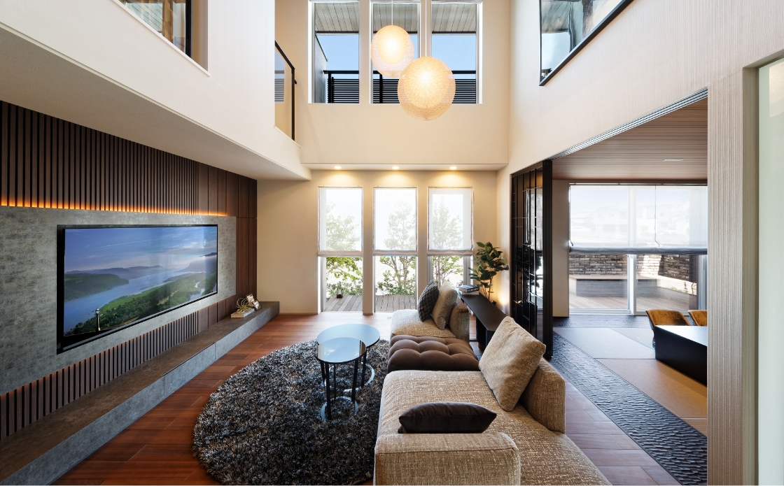 屋根から基礎まで家の外側を高性能な断熱材ですっぽり覆う外断熱工法を採用しています。断熱等級6を標準とした高い断熱性能、気密性能、換気性能を備えた高性能住宅により、計画的に空気の流れを作ることができ、温度ムラが生じにくいのが特徴です。